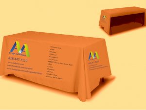 Our 4 sided table cover is a great table topper for trade shows, exhibitions, and any presentations. Our table covers are dye sublimated and are 100% washable. This table cover is made of 8.8 oz. polyester table fabric with rounded corners and hangs approximately 2″ above the floor.  This material drapes over 4 sides of a 72″ x 30″ x 30″ display table.  Complete your presentation with our simple and cost-effective table cover.